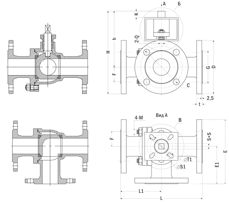 Кран шаровой трех ходовой из нержавеющей стали aisi 304 Т/L-порт ДУ 15-100 Ру 16