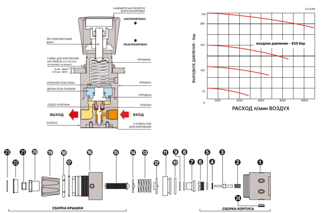 Характеристики регулятора на высокое давления с поршнем/плунжером на 420 Бар (42МПа)